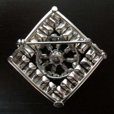 Excellent condition, vintage evening dress brooch signed Azub Austria. Square shape, 1 1/2 X 1 1/2 inches, amber and white glass stones. Silver rhodium plated base. Beautiful flower shape, sturdy holding pin.