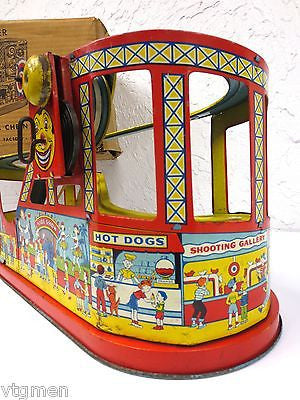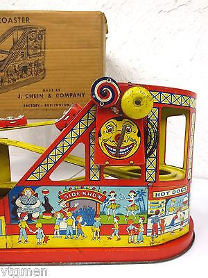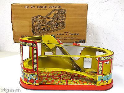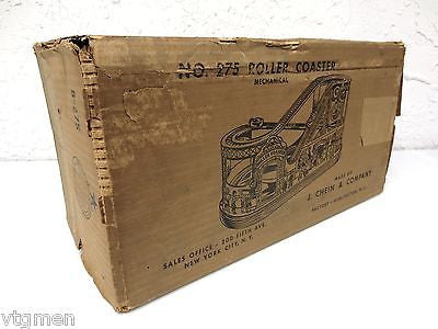 - Box is marked "No. 275 Roller Coaster Mechanical, Made by J. Chein & Company, Factory - Burlington, N.J., Sales Office - 200 Fifth Ave. New York City, N. Y."