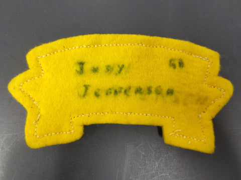 Handmade 1950's patch signed "Judy Jefferson 50". Thick weaved letters, cotton on felt. Measures 5 X 2.25 inches.