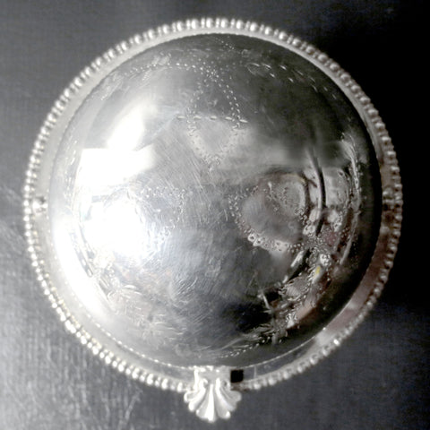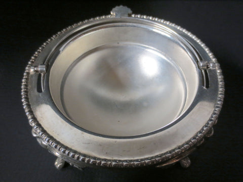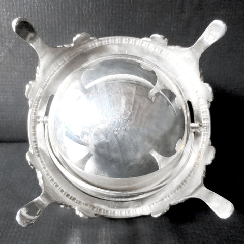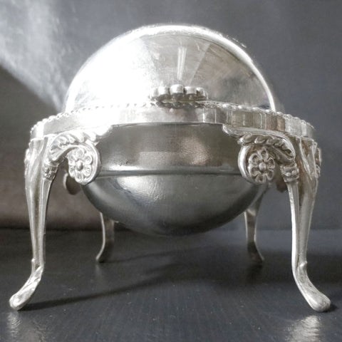 Excellent condition, perfect silver plating. Marked "Hand Engraved, Best Silver Plate, Made in England". Has a 4.75 inches diameter and is 4.75 inches tall. Very stable on its 4 legs. Top rolls up and down easily. Beautiful flowers and leaves ornaments. Also great to serve candies and spices.